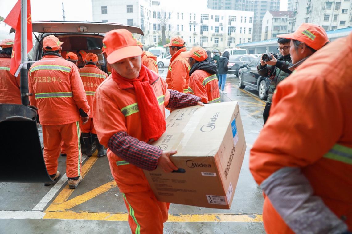 环卫工人正在接收“好看暖冬礼包”物资
